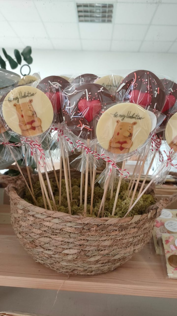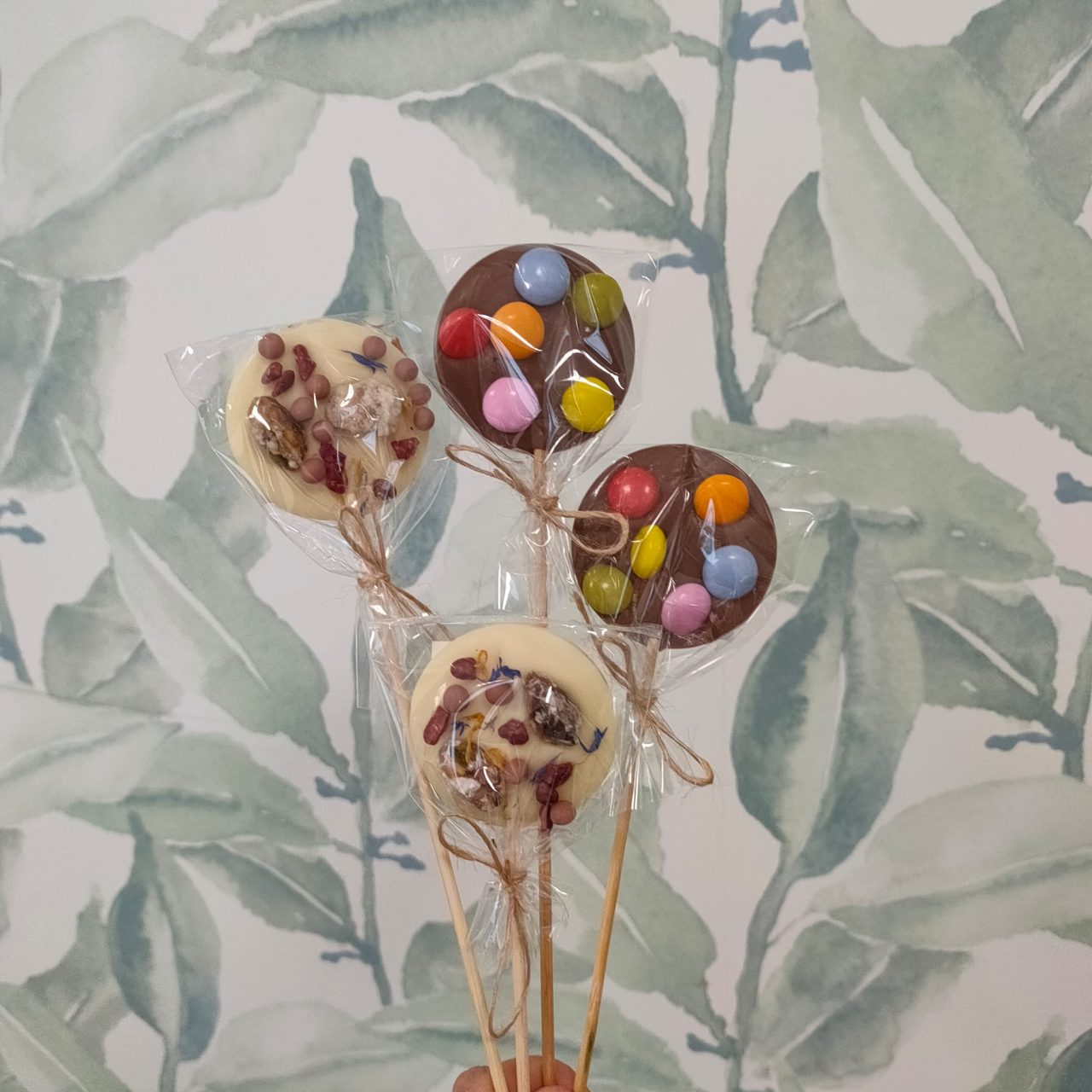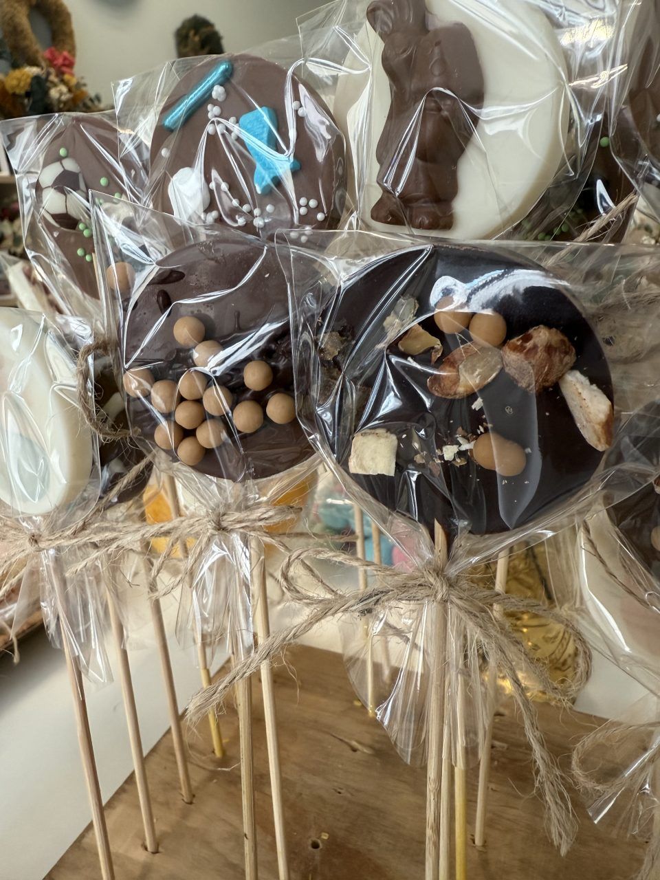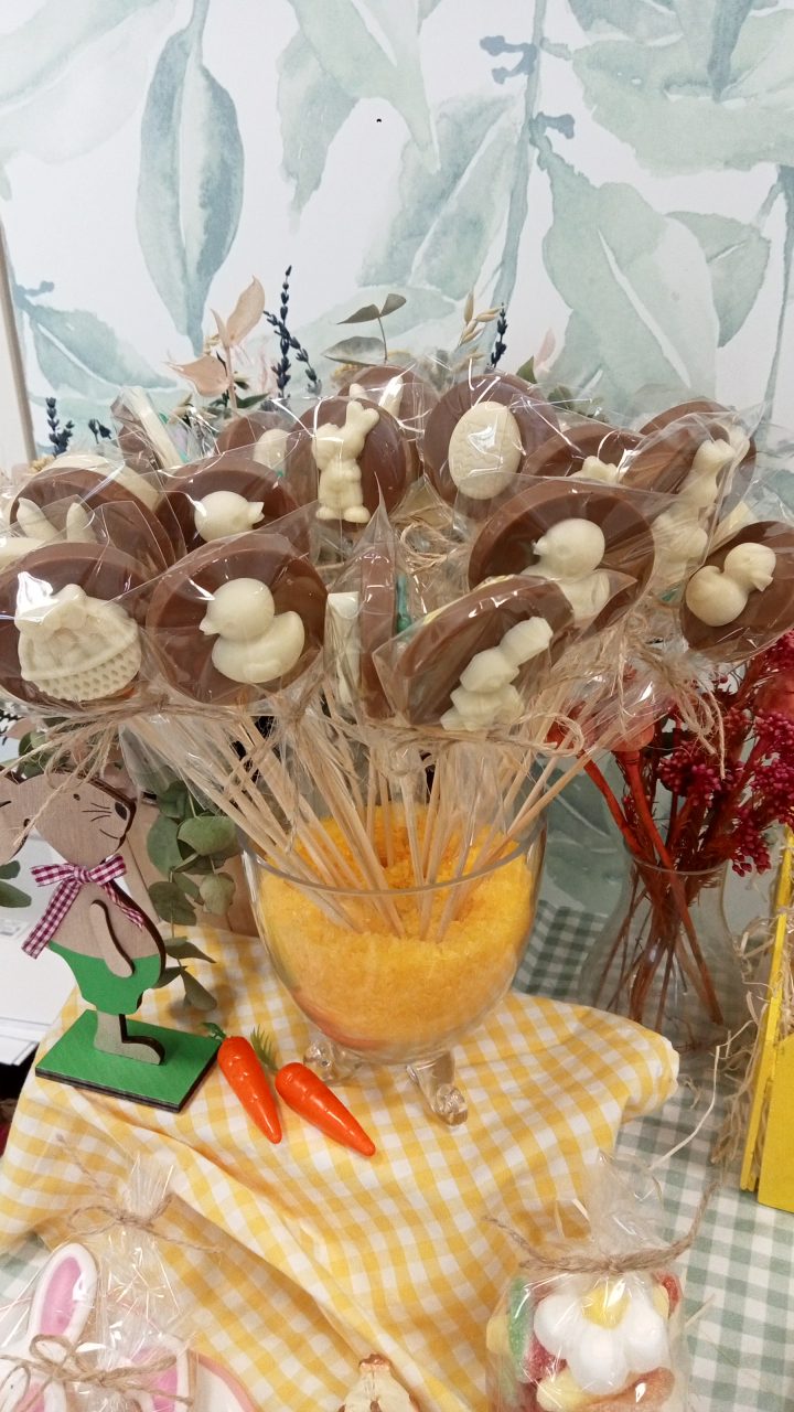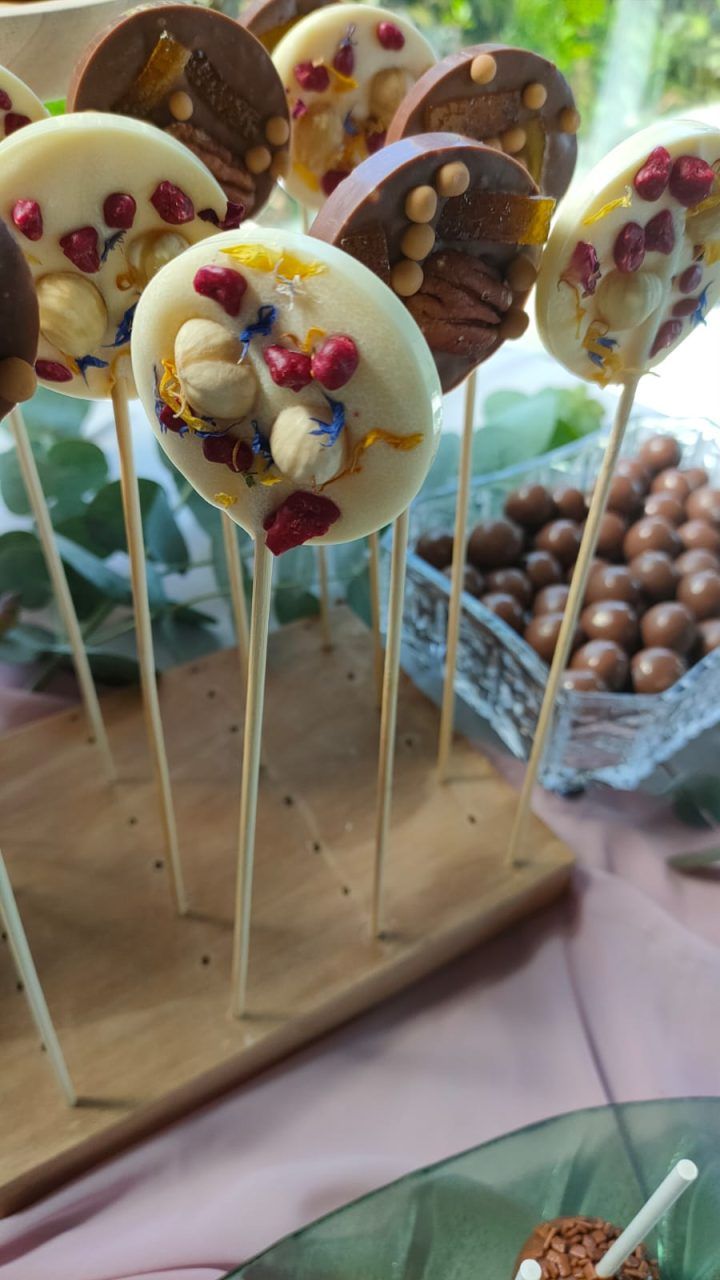 Piruletas artesanas de chocolate blanco o con leche y decoradas con bolitas de chocolate, frutos secos, etc…