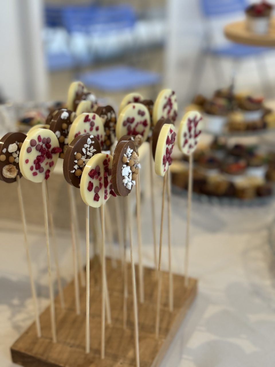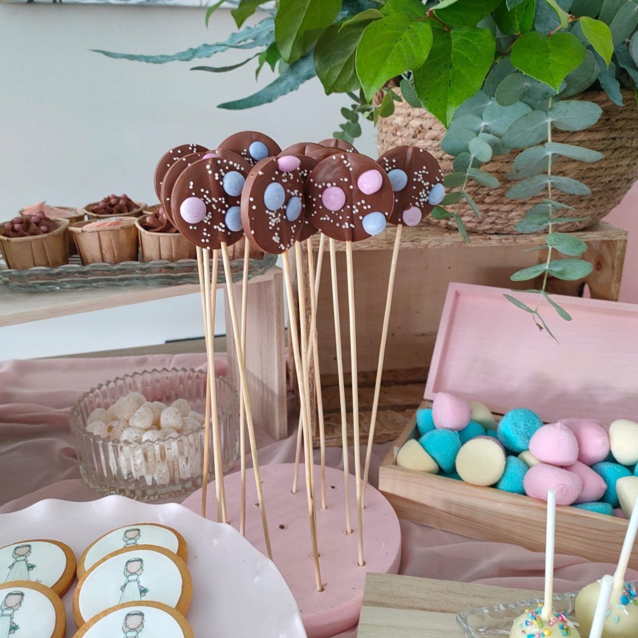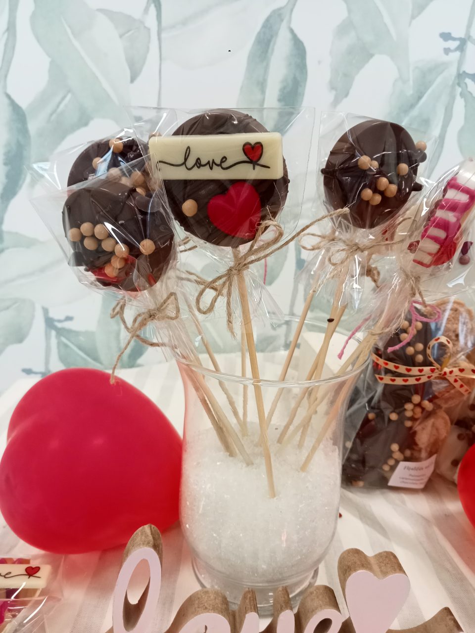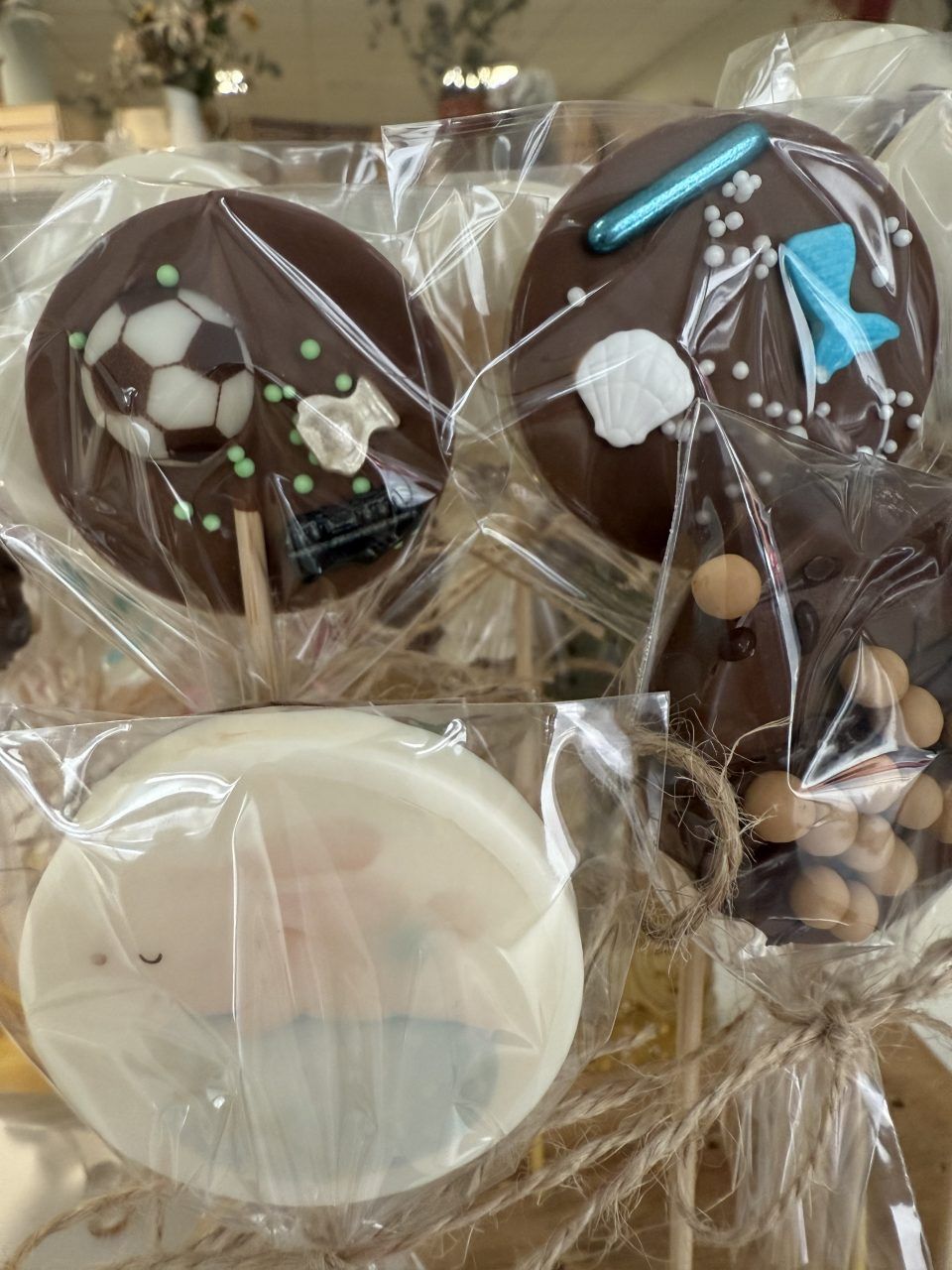 Piruletas artesanas de chocolate blanco o con leche y decoradas con bolitas de chocolate, frutos secos, etc…