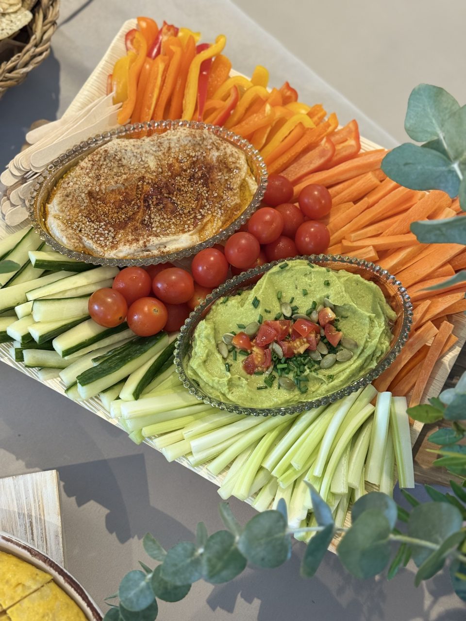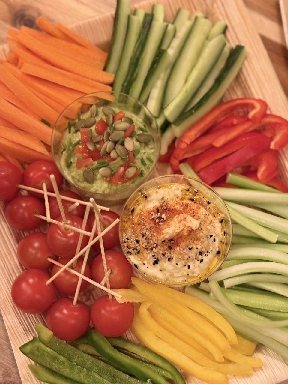 • Tabla dips, hummus y guacamole con nachos y crudités de verduras